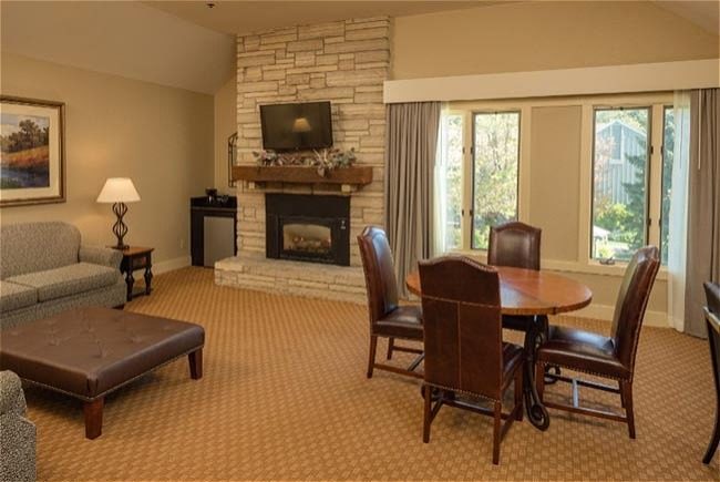 King Fireplace Main Lodge Room - King-size bed, gas fireplace, separate seating area with sofa and two person jetted bathtub.