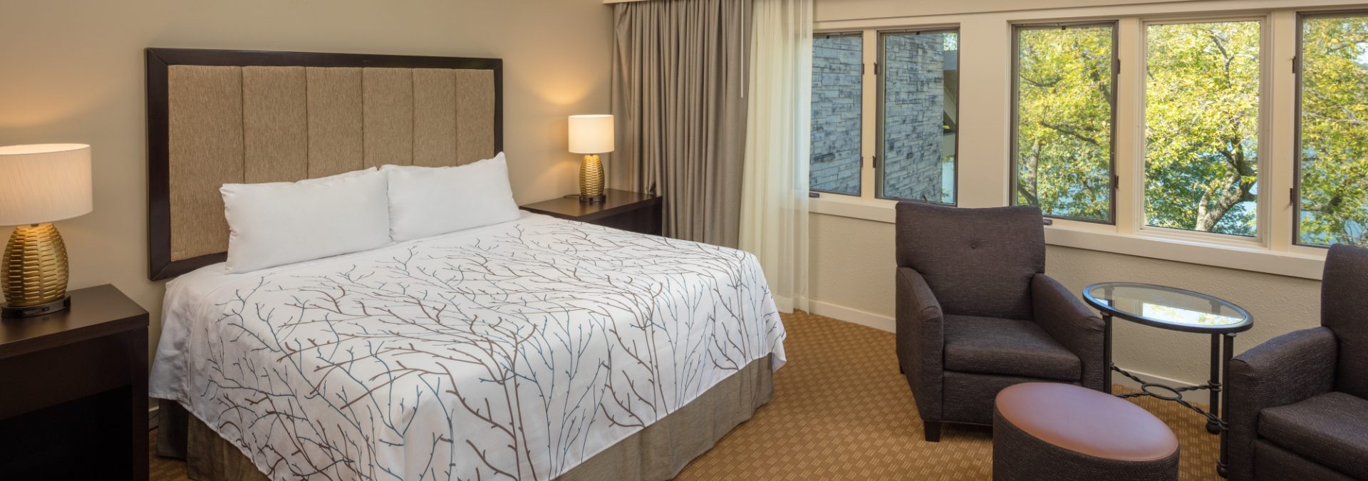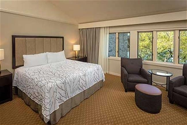 The charming Main Lodge of Eagle Ridge Resort & Spa offers guest rooms and suites with two queens or a king-size bed. These beautifully-decorated accommodations are close to the resort's many amenities, including the indoor swimming pool, fitness center, Stonedrift Spa and Woodlands Restaurant & Lounge.